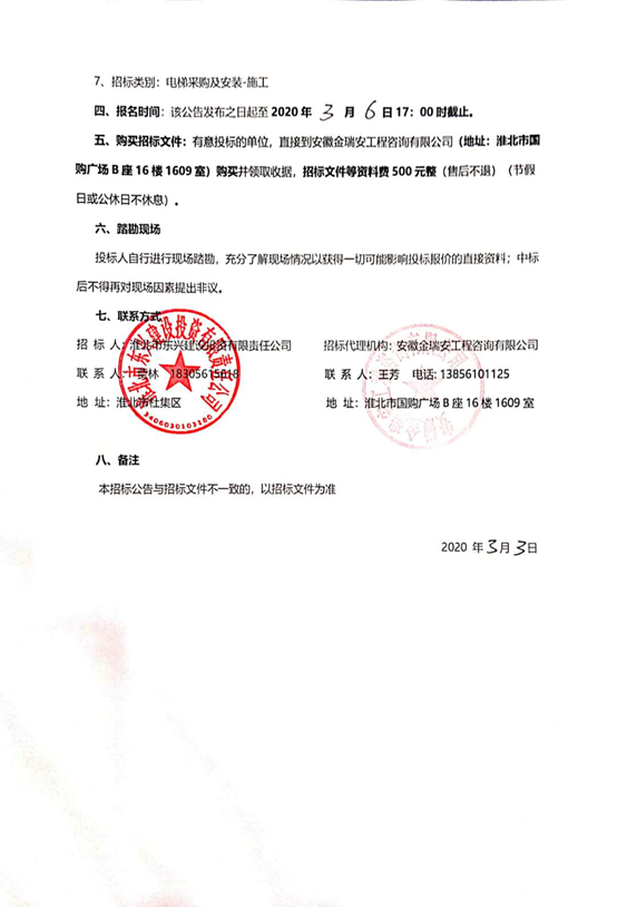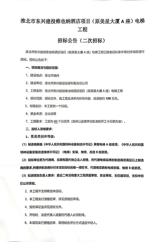 淮北市東興建投維也納酒店項目(原美星大廈A座)電梯工程招標公告(二次招標) 2020-03-03 16:03 上一篇:淮北北站站前廣場景觀綠化采購項目 投標邀請(招標公告) 下一篇:安徽省淮北市杜集區重點采煤沉陷區杜集區人民醫院搬遷項目地質災害報告書編制詢價公告 返回列表